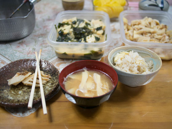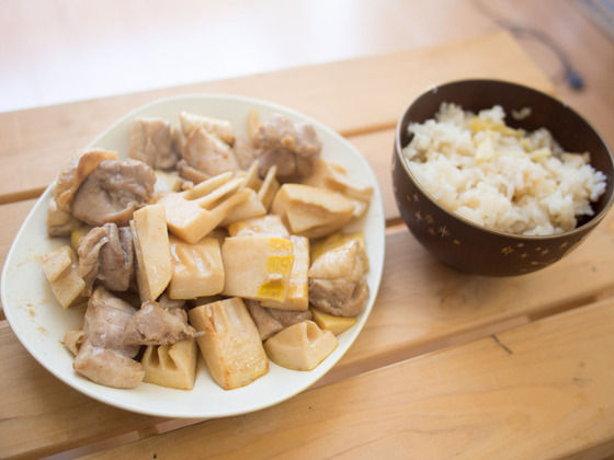 昼食はタケノコご飯とタケノコと鶏肉の炒め物。