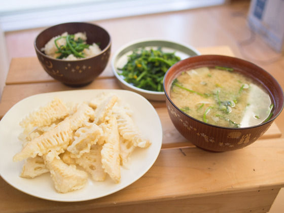 夕食はタケノコの天ぷら、姫皮と菜の花の味噌汁(特盛)、菜の花の辛し和え、