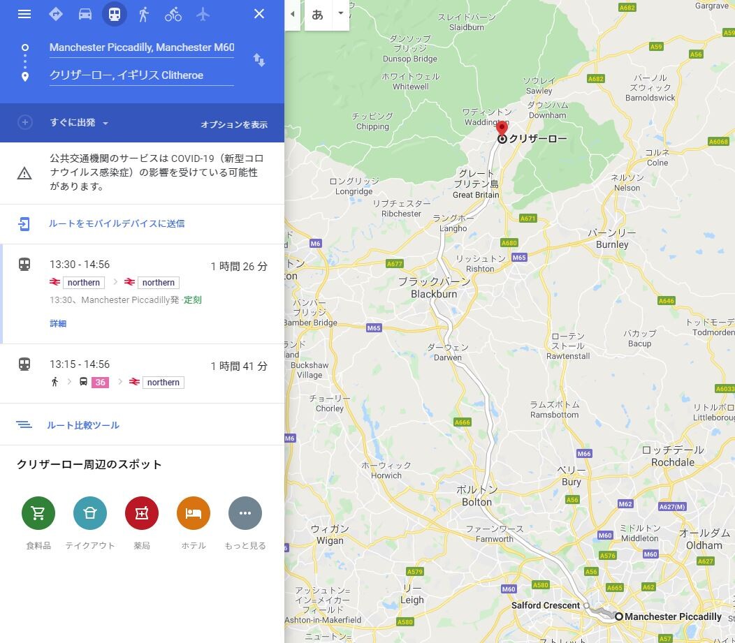 ルートはこちら、Clitheroeまでは電車で1回乗り換え。