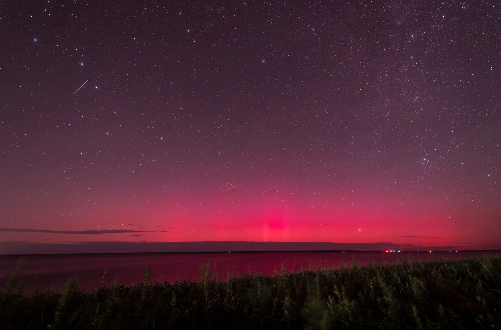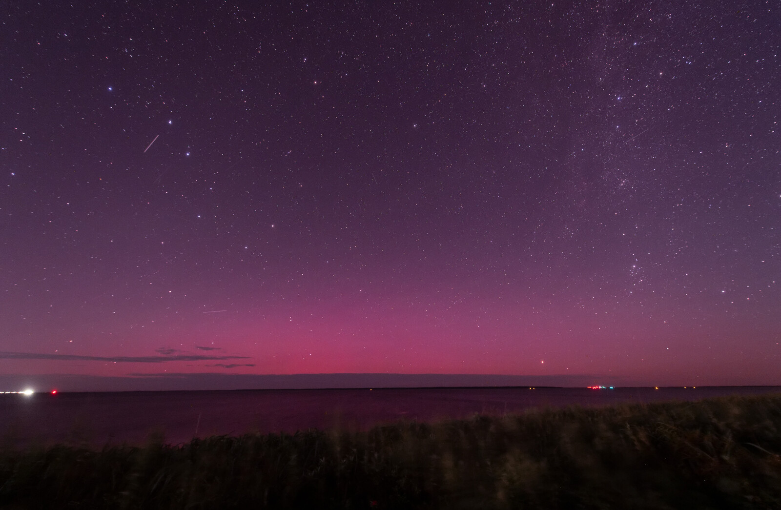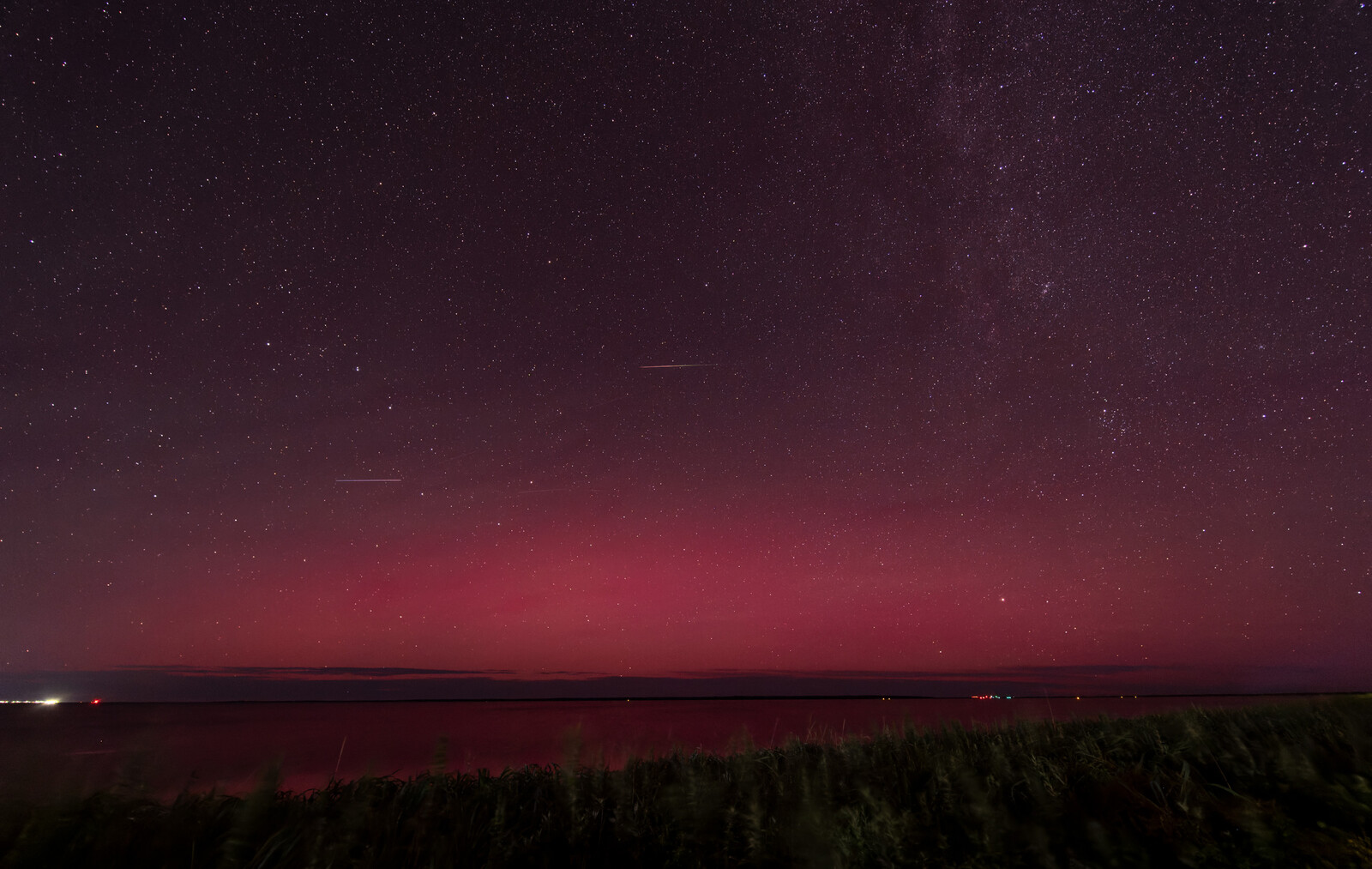 視野全体に広がるのは低緯度オーロラと思われますが、薄明の影響もあるでしょうか。