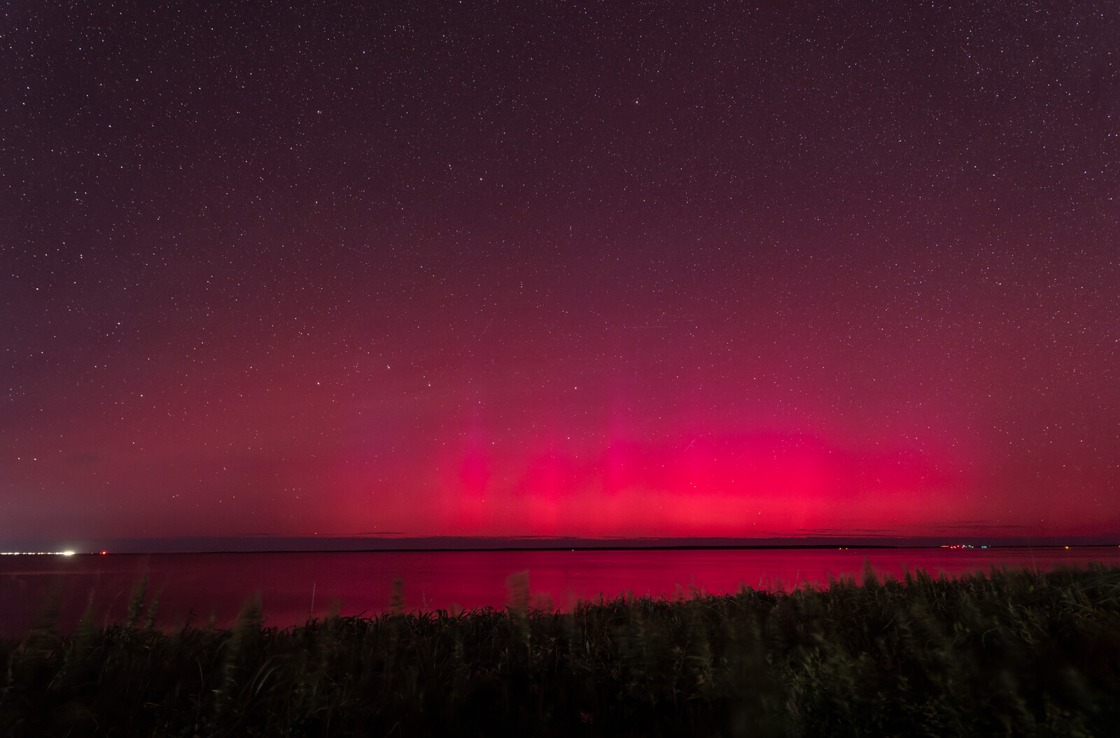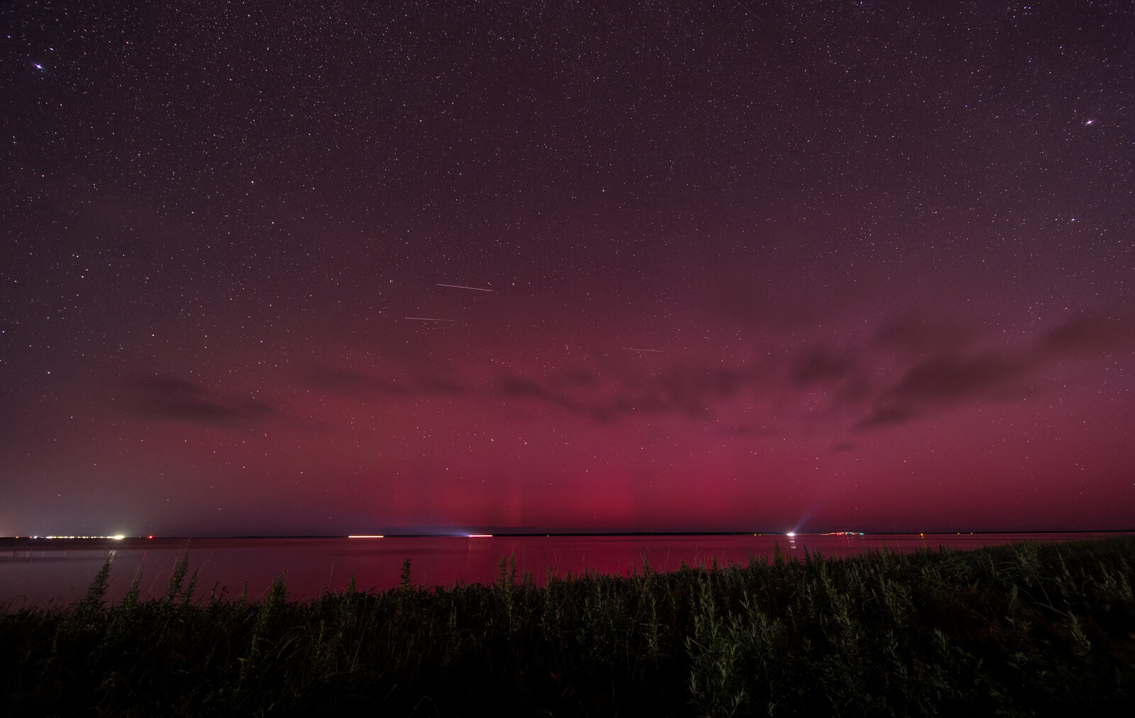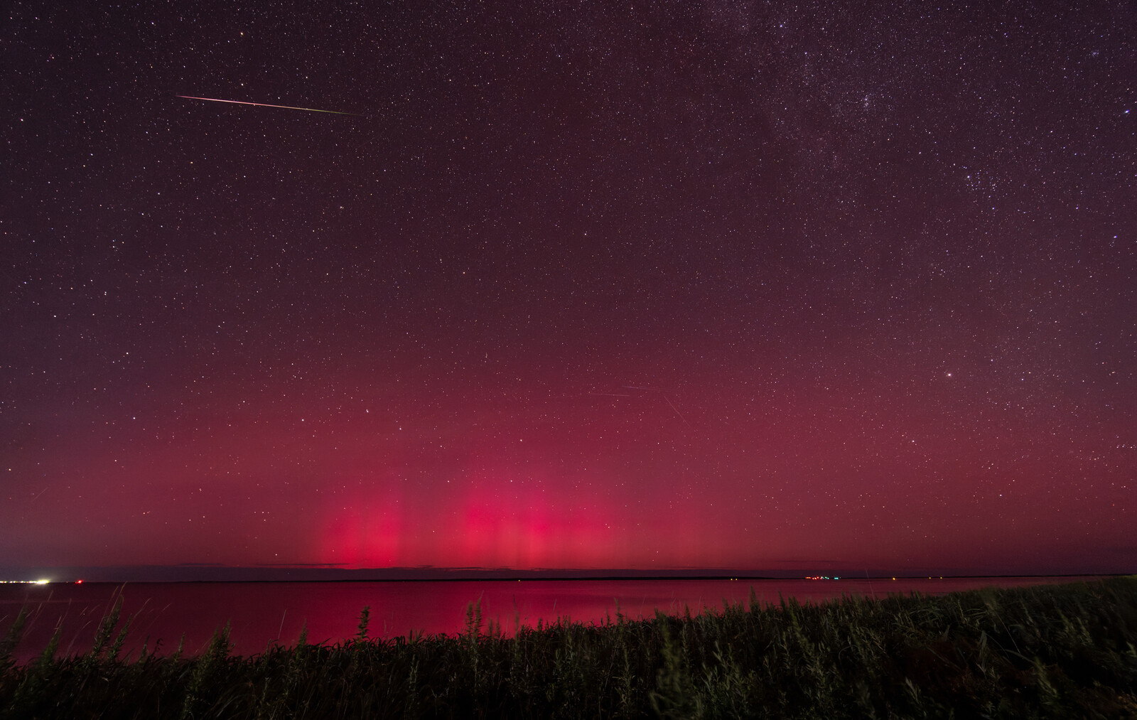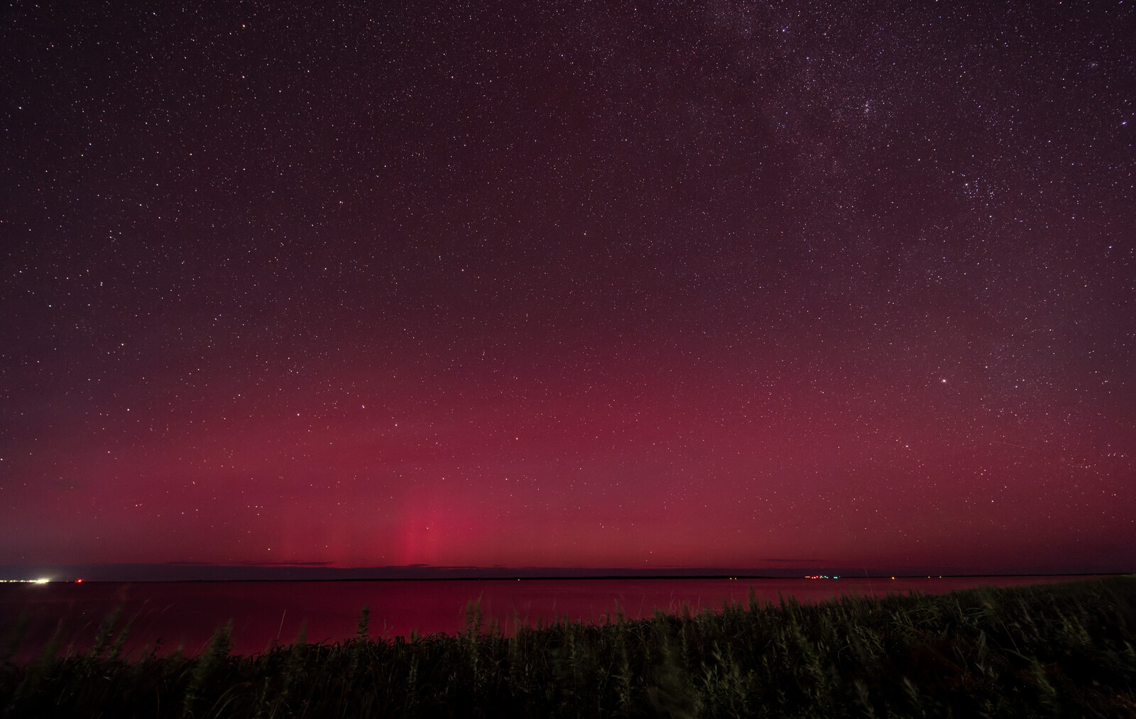 視野全体に広がるのは低緯度オーロラと思われますが、薄明の影響もあるでしょうか。